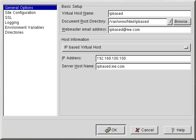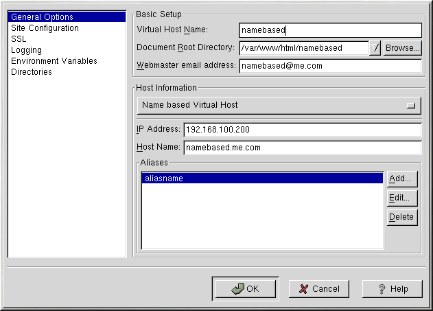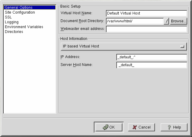 Die Einstellungen der General Options gelten nur für den virtuellen Rechner, den Sie gerade konfigurieren. Geben Sie den Namen des virtuellen Rechners im Textfeld Virtual Host Name an. Dieser Name wird vom Apache-Konfigurationstool verwendet, um zwischen den einzelnen virtuellen Rechnern zu unterscheiden.