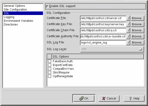 Wenn ein Apache-Server nicht mit SSL-Support konfiguriert wurde, wird die Kommunikation zwischen einem Apache-Server und seinen Clients nicht verschlüsselt. Dies ist empfehlenswert für Websites, die keine persönlichen oder vertraulichen Daten enthalten. Eine Open-Source Website, auf der Open-Source Software und die zugehörige Dokumentation zur Verfügung steht, benötigt dagegen keine Verschlüsselung. Eine e-Commerce Website, auf der Informationen über Kreditkarten verarbeitet werden, sollte den SSL-Support von Apache für die Verschlüsselung der Kommunikation verwenden. Mit diesem Support wird das Modul mod_ssl aktiviert. Um dieses Modul mithilfe des Apache-Konfigurationtools zu aktivieren, müssen Sie den Zugriff über Port 443 unter Main tab => Available Addresses zulassen. Weitere Informationen finden Sie unter Abschnitt namens Grundeinstellungen. Wählen Sie den Namen des virtuellen Rechners in Virtual Hosts, klicken Sie auf Edit, wählen Sie SSL aus dem links aufgeführten Menü und markieren Sie die Option Enable SSL Support wie in Abbildung 11-13 angegeben. Der Abschnitt SSL Configuration ist mit dem digitalen Dummy-Zertifikat vorkonfiguriert. Das digitale Zertifikat liefert die Berechtigung für Ihren sicheren Web-Server und kennzeichnet den Client Web-Browsern den sicheren Server. Sie müssen Ihr eigenes digitale Zertifikat erwerben. Verwenden Sie nicht das Dummy-Zertifikat von Red Hat Linux. Weitere Informationen hierüber finden Sie unter Apache-Related Reference des Offiziellen Red Hat Linux Referenzhandbuchs.