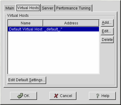 Sie können das Apache-Konfigurationstool verwenden, um virtuelle Webserver zu konfigurieren. Virtuelle Websever ermöglichen es Ihnen, verschiedene Server für verschiedene IP-Adressen, verschiedene Rechnernamen oder verschiedene Ports auf dem gleichen Rechner auszuführen. Anhand von virtuellen Webservern können Sie die Website für http://www.your_domain.com and http://www.your_second_domain.com auf dem gleichen Apache-Server ausführen. Diese Option entspricht der Anweisung <VirtualHost> für den standardmäßigen virtuellen Webserver und die IP- basierten virtuellen Rechner. Im Falle eines namensbasierten virtuellen Rechners entspricht diese Option der Anweisung <NameVirtualHost>.