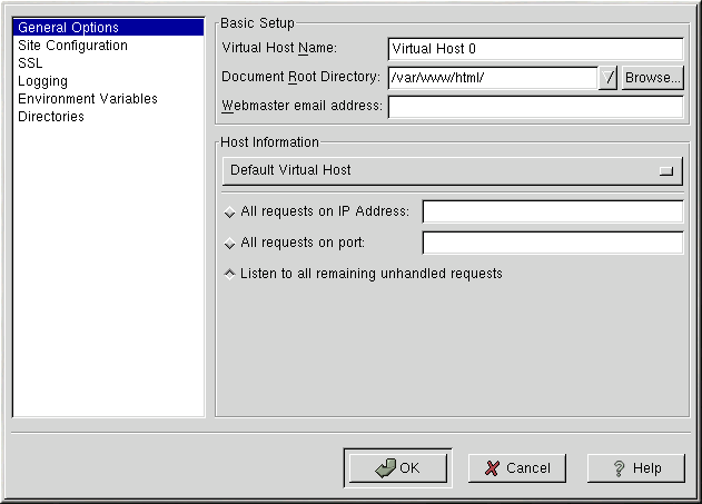 Die Einstellungen der General Options gelten nur für den virtuellen Rechner, den Sie gerade konfigurieren. Geben Sie den Namen des virtuellen Rechners im Textfeld Virtual Host Name an. Dieser Name wird vom Apache-Konfigurationstool verwendet, um zwischen den einzelnen virtuellen Rechnern zu unterscheiden.