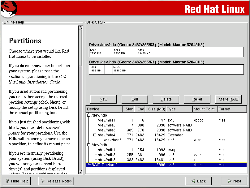 Software RAID can be configured during the graphical installation of Red Hat Linux or during a kickstart installation. You can use fdisk or Disk Druid to create your RAID configuration, but these instructions will focus mainly on using Disk Druid to complete this task.