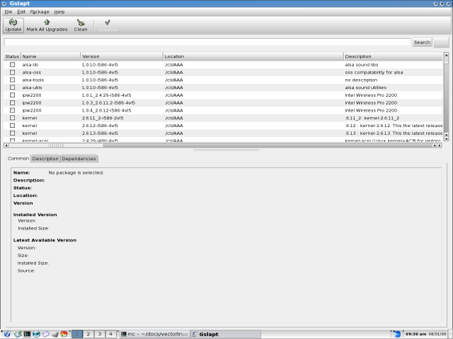 1. IntroductionUnlike the Microsoft Windows world which uses executable .exe files to install software the Linux world uses "packaging systems". Red Hat Linux and Mandriva use .rpm packages, Ubuntu, Debian, Mepis, Xandros use .deb packages and Slackware/Vector use .tgz packages. VectorLinux also now uses ".tlz" packages, which take less space and enable us to provide more software on one CD. Many Linux packages are contained in FTP repositories and software is available which automates the download and installation of the correct package for your system in one easy step. VectorLinux has introduced a new package management system based on slapt-get (text mode) and gslapt (graphical, GUI mode), as of November 2005. The VectorLinux packaging system is based around the Slackware packaging system and consists of .tgz or .tlz packages. However, the Slackware system has been improved by slapt-get. slapt-get mimics the Debian apt packaging system. It automates the download, cataloguing and install process and also provides some dependancy checking which was not available with the Slackware system. gslapt is a GUI-based wrapper around slapt-get, so is the recommended packaging software for newcomers to VectorLinux. On the other hand if you are a confident command line user you will find slapt-get, coupled with piping to other Linux commands very powerful. slapt-get and gslapt enable VectorLinux users to easily download, install, upgrade, remove, search, and query packages of software on their system. You only really need need to do two steps to install/upgrade or remove software packages :
